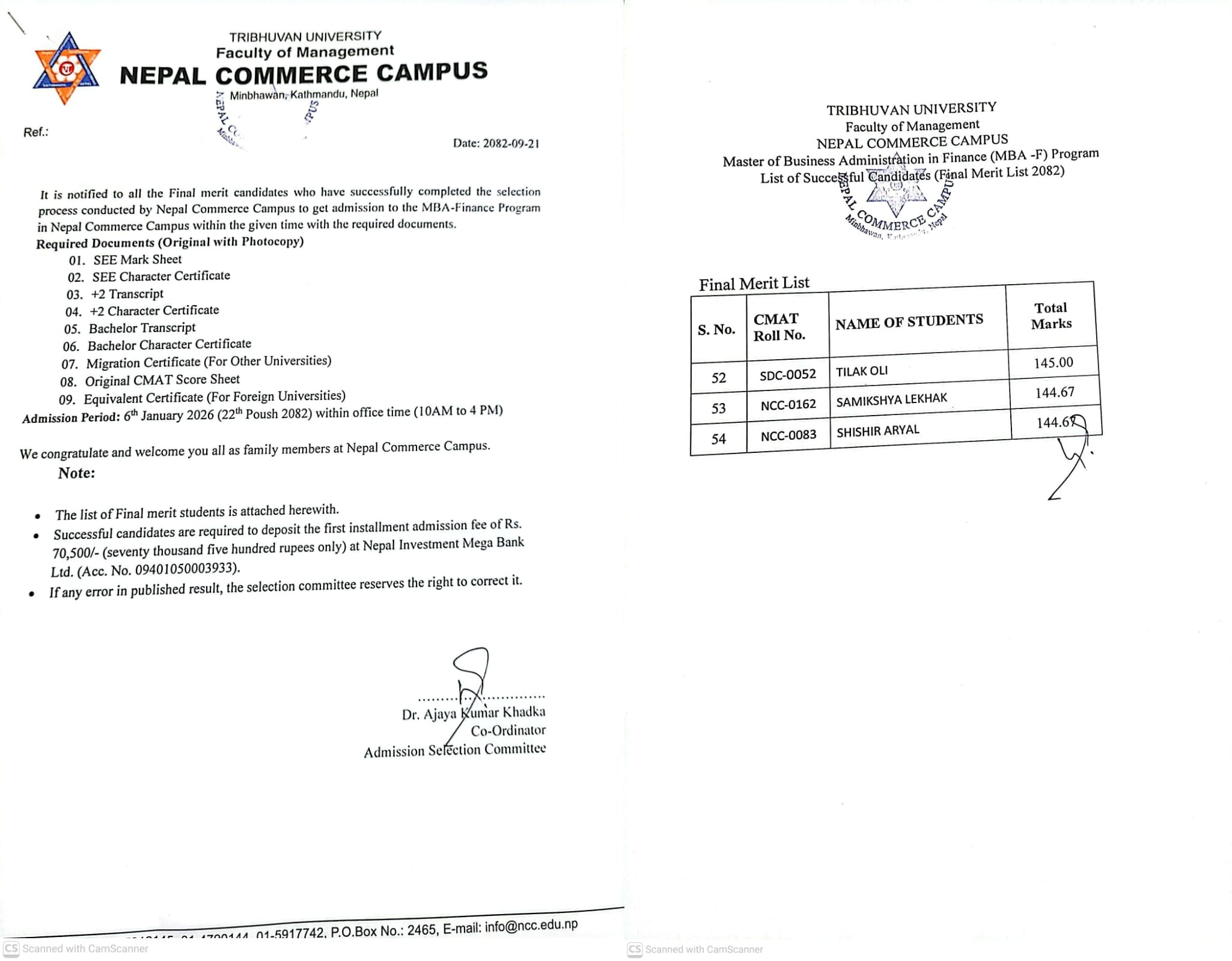 MBA Finance Final Merit List for Admission 2082