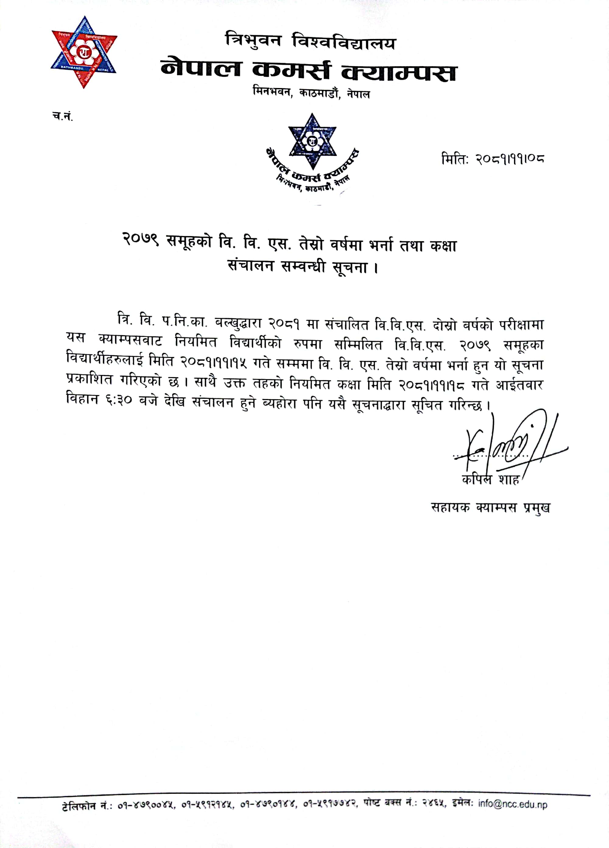 २०७९ समूहको bbs तेस्रो वर्षमा भर्ना तथा कक्षा सञ्चालन सम्बन्धी सूचना