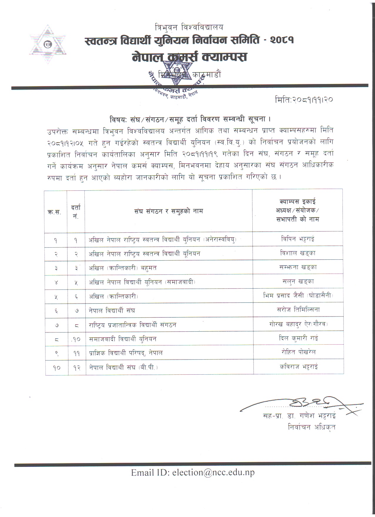 संघ /संगठन /समुह दर्ता नामावली सम्वन्धी सुचना