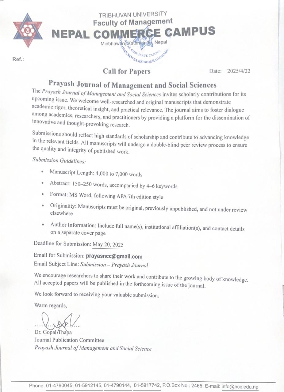 Call for Papers: Prayash Journal of Management and Social Sciences