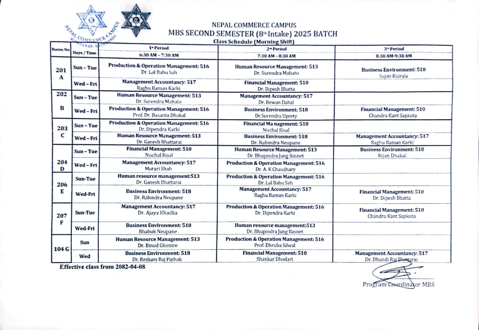 MBS 2nd Semester Class Routine 2025